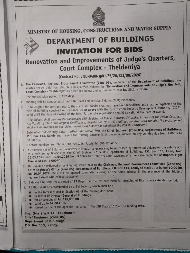 | Renovation and Improvements of Judge's Quarters, Court Complex- Theldeniya | 10th April 2026 | PDF Attachment |